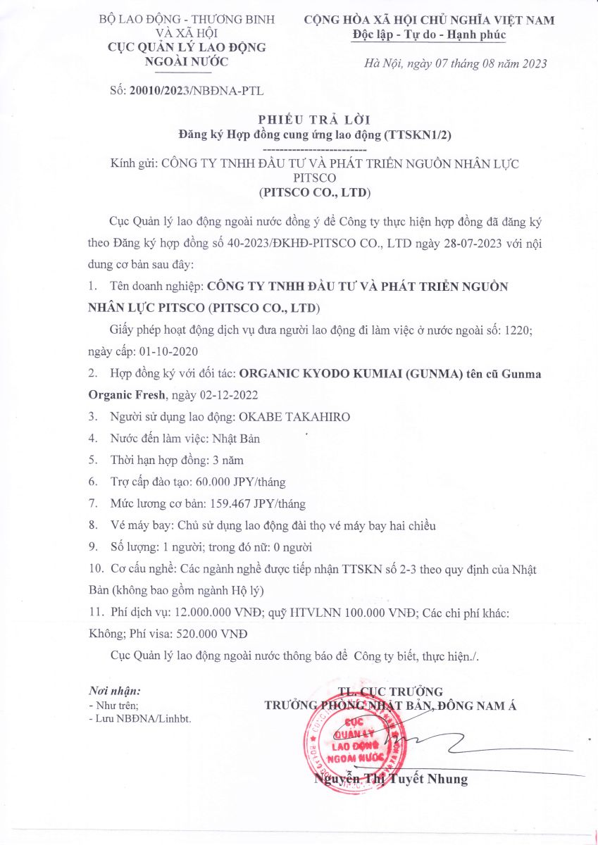 Phiếu trả lời số 2025-57262-QLLĐNN-ĐKHĐ ngày 18/11/2025 Nghiệp đoàn AKITA