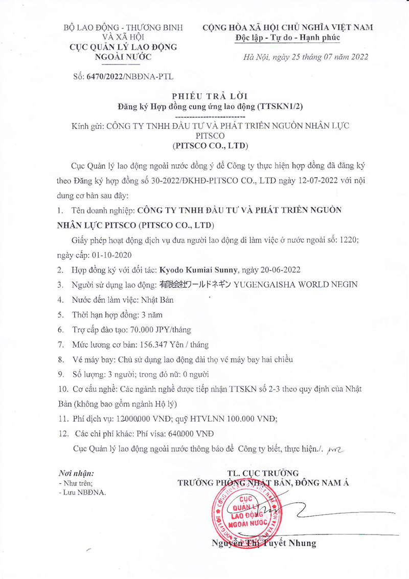 Phiếu trả lời số 6470/2022/NBDNA-PTL ngày 25/07/2022 Nghiệp đoàn SUNNY
