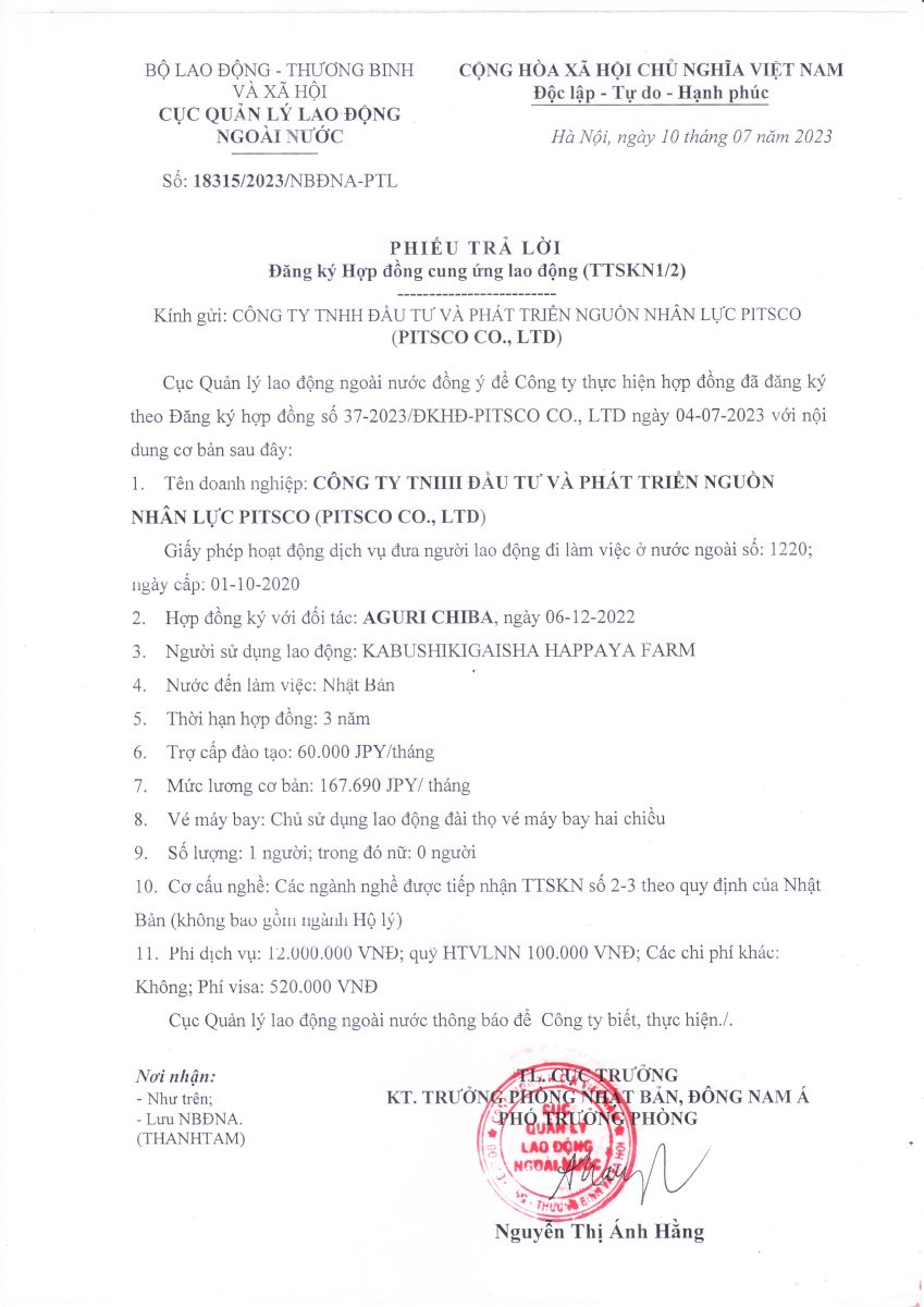 Phiếu trả lời Cục QLLĐ NN