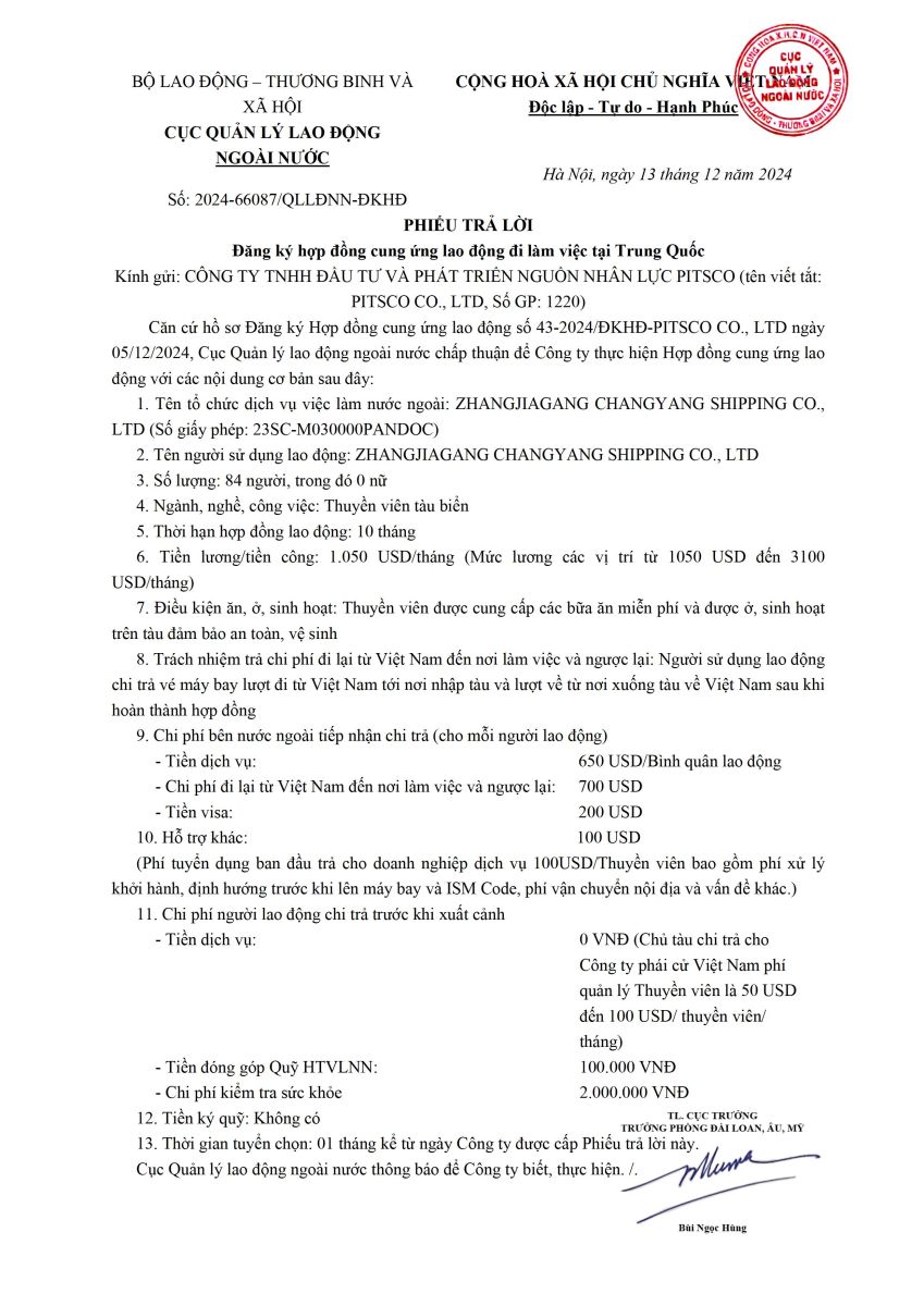 Phiếu trả lời số 2024-66087-QLLĐNN-ĐKHĐ Thuyền viên ngày 13.12.2024