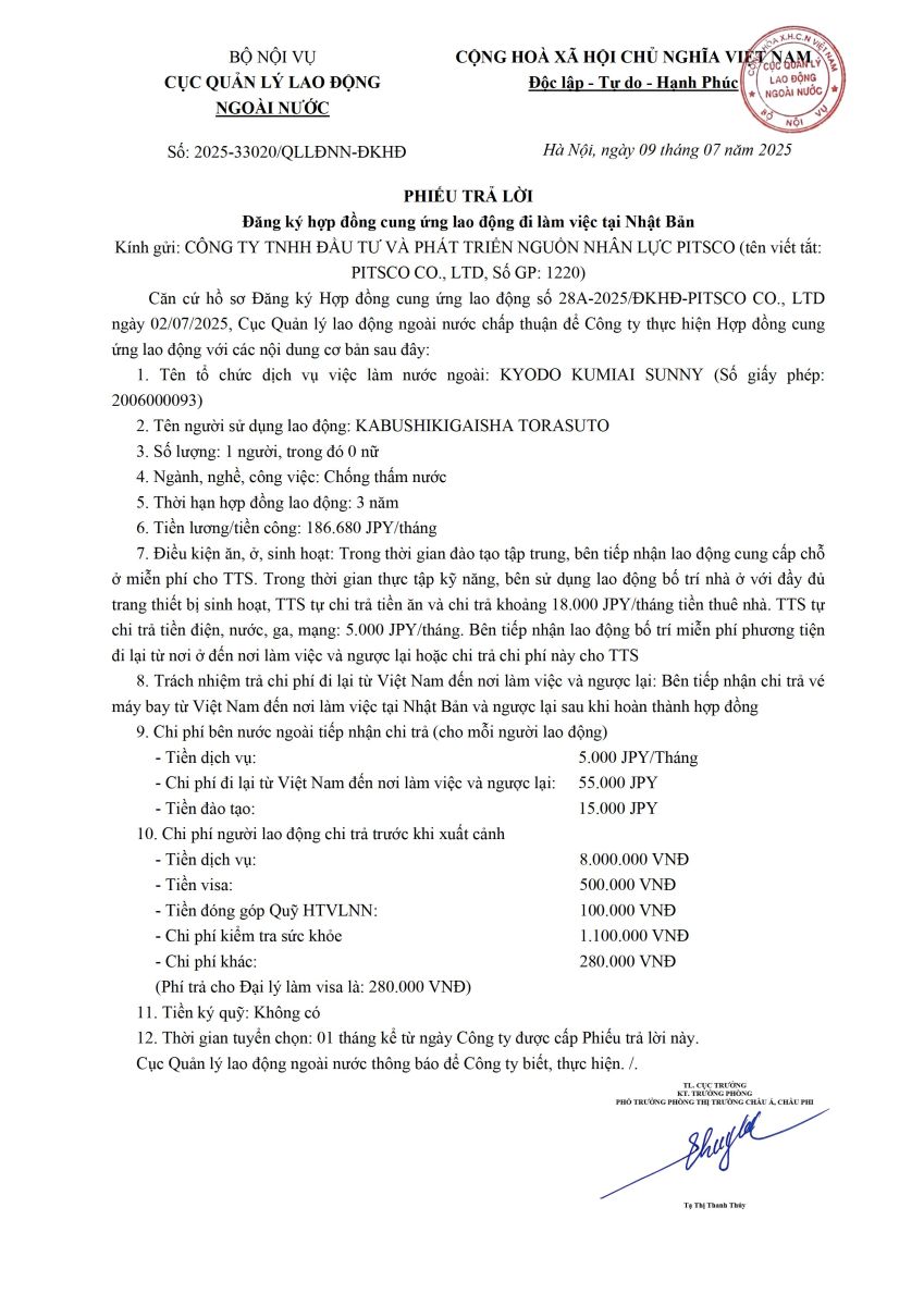 Phiếu trả lời số 2025-33020-QLLĐNN-ĐKHĐ ngày 09/07/2025 Nghiệp đoàn SUNNY