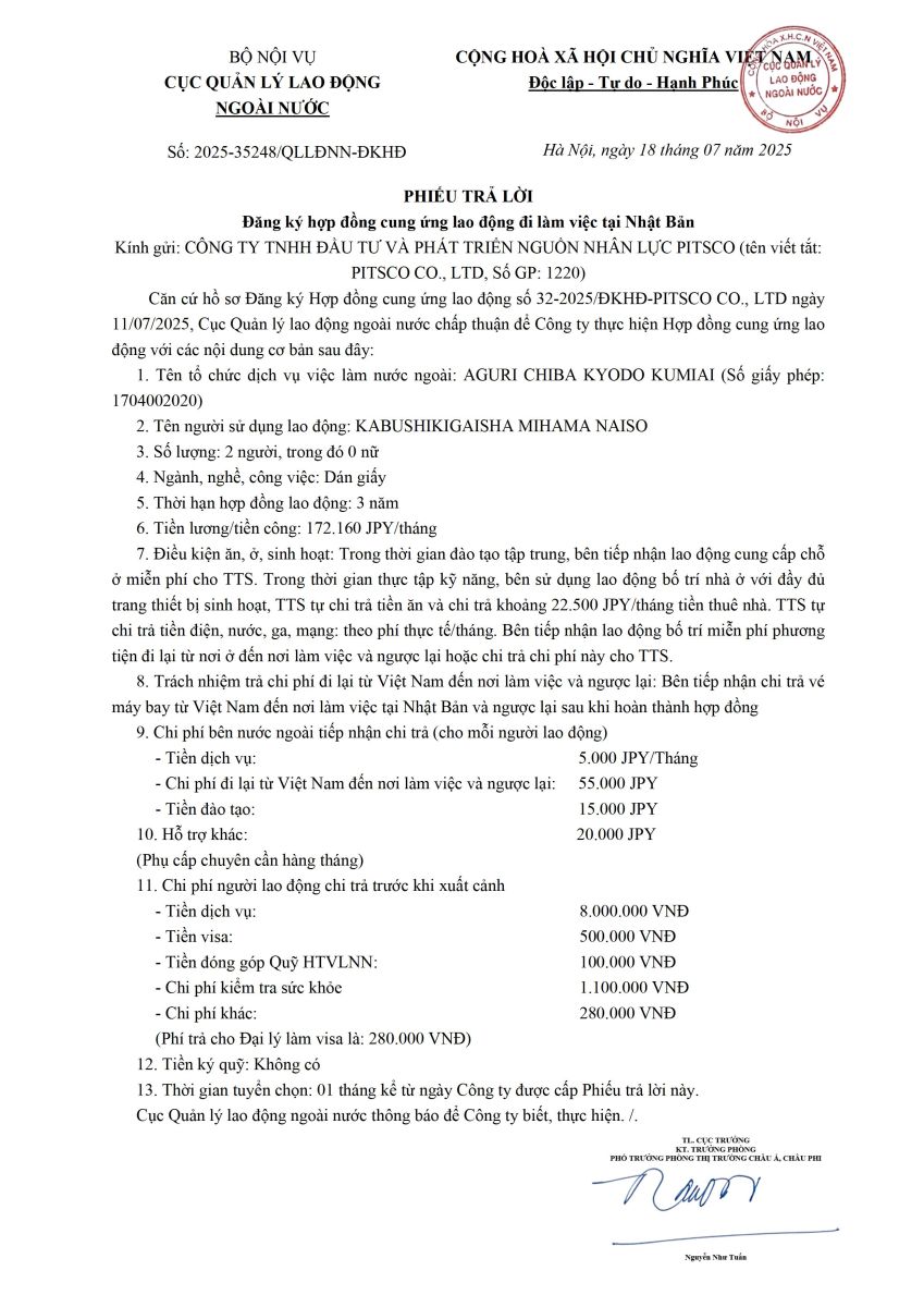 Phiếu trả lời số 2025-35248-QLLĐNN-ĐKHĐ ngày 18/07/2025 Nghiệp đoàn AGURI