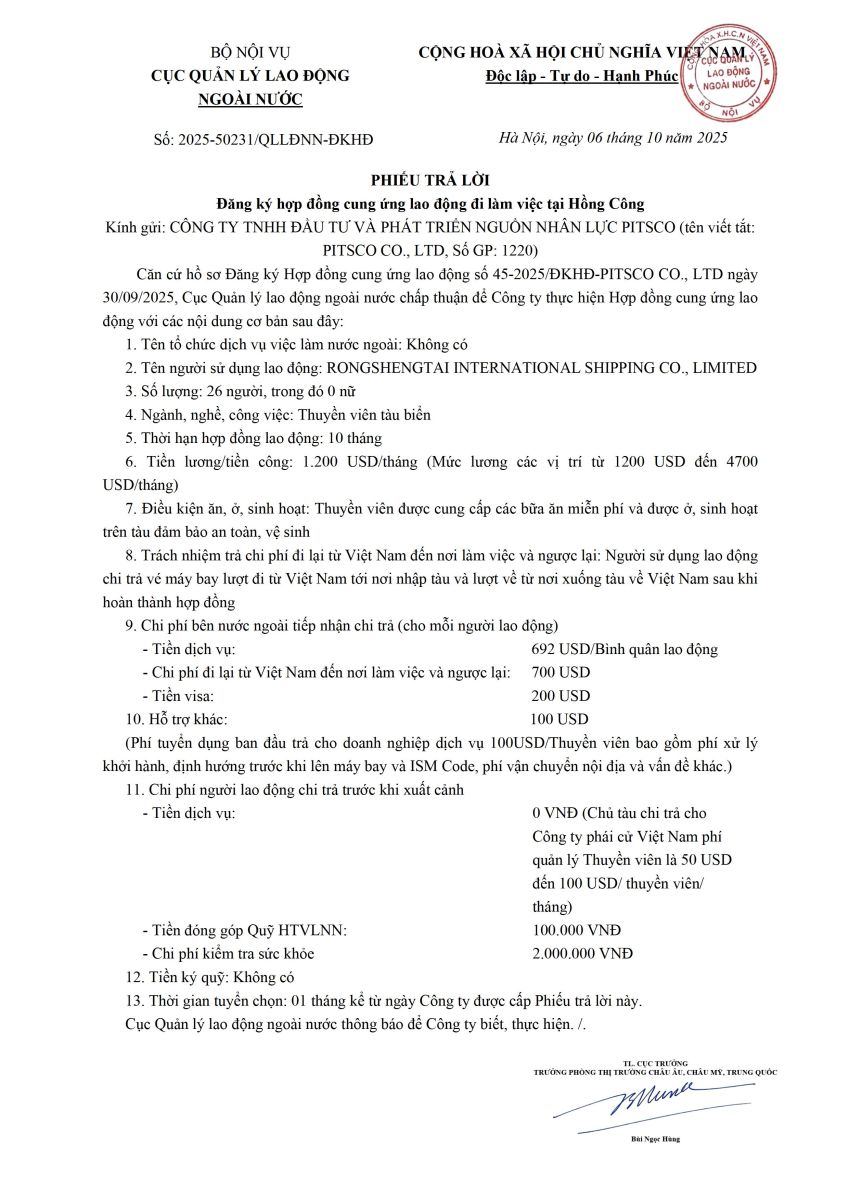 Phiếu trả lời số 2025-50231-QLLĐNN-ĐKHĐ Thuyền viên ngày 06.10.2025