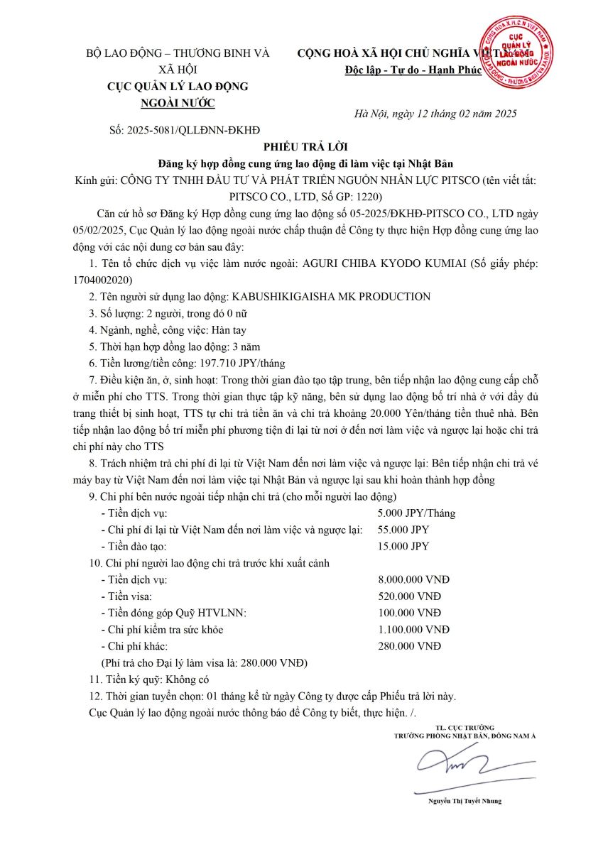 Phiếu trả lời số 2025-5081-QLLĐNN-ĐKHĐ ngày 12/02/2025 Nghiệp đoàn AGURI